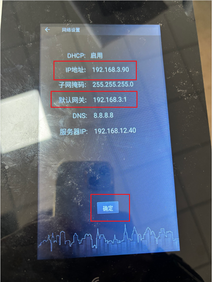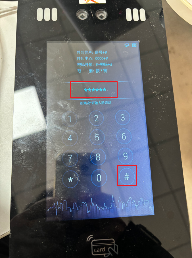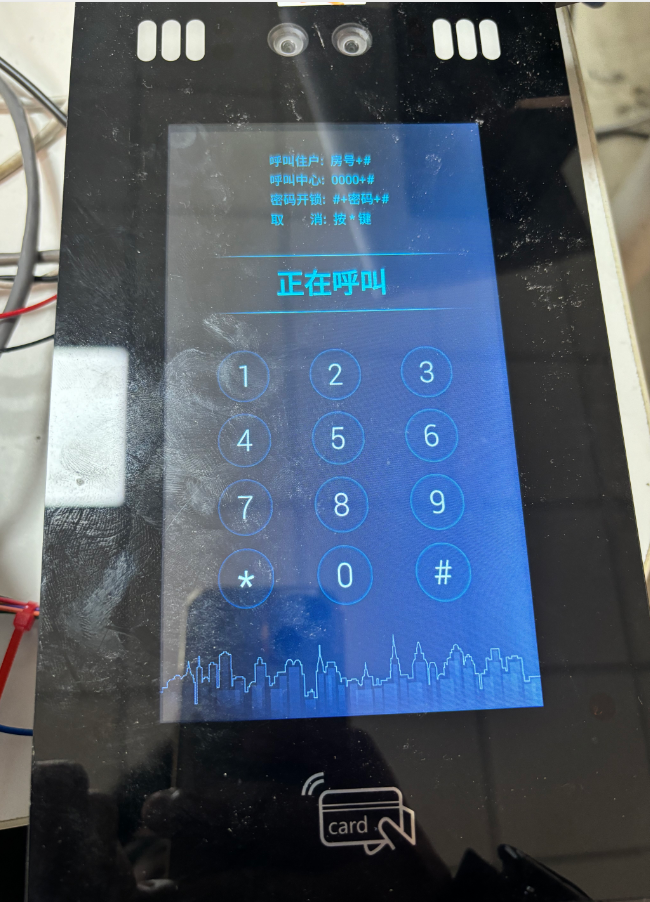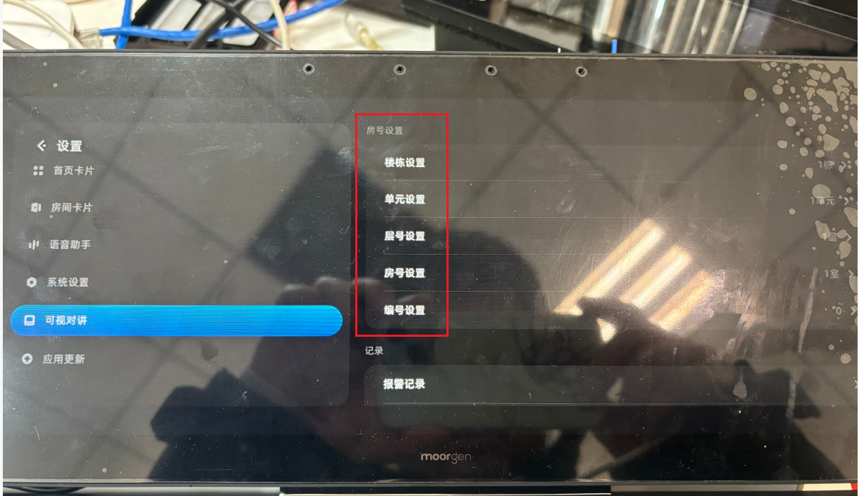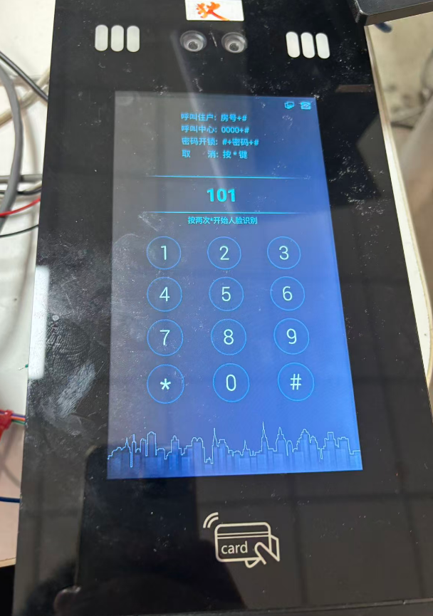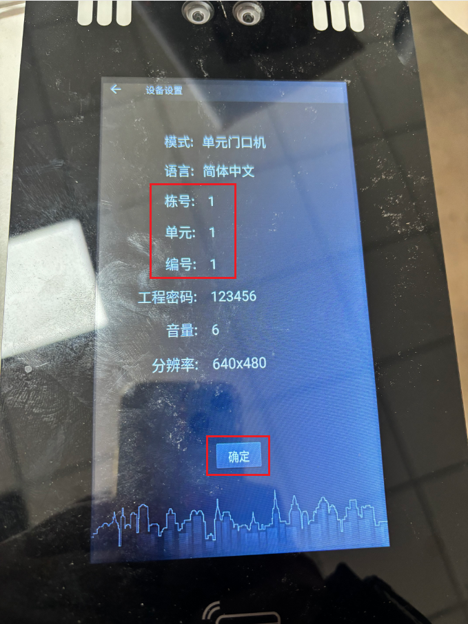 --- --- # 可视对讲配置操作说明 ##### (狄耐克屏搭配狄耐克门口机) ## 一、线路连接 调试时线路连接参考图如下:  ## 二、狄耐克门口机配置 #### 1、进入系统设置 在门口机上点击两次“#”,输入工程密码(123456),然后点击“#”进入系统设置   #### 2、配置设备设置 在系统设置界面点击进入设备设置界面,并配置栋号、单元、编号,配置完成后点击确定  #### 3、配置网络设置 在系统设置界面点击进入网络设置界面,并修改IP地址和默认网关,使其的网段与路由器的网段一致  #### 4、确认配置情况 在系统设置界面点击进入版本信息界面,查看门口机的IP的网段是否正确  ## 三、智慧屏配置 #### 1、房号设置 进入智慧屏的设置中的可视对讲界面,并依次配置楼栋设置、单元设置、层号设置、房号设置、编号设置 注意:1、楼栋设置和单元设置需和门口机上的栋号、单元一致 2、若只有一个门口机,则智慧屏上的编号设置为0  ## 四、对讲测试 #### 1、智慧屏查看门口机监控 在智慧屏得首页点击可视对讲卡片上的监控,有画面且界面中的功能正常可控即可   #### 2、门口机呼叫智慧屏(例楼栋:1;单元:1;层号:1;房号:1;编号:0) 在门口机上拨号输入101,等待门口机呼叫智慧屏。门口机未提示呼叫失败,且智慧屏正常弹出呼叫弹窗即可